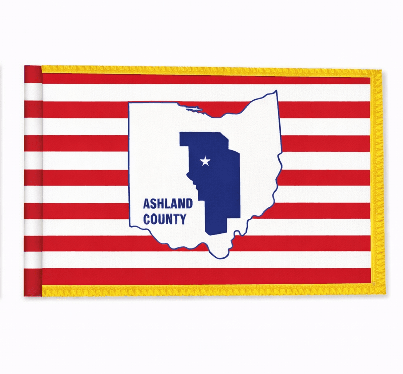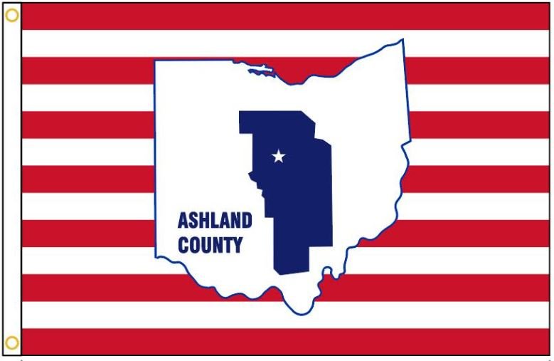 Ashland County's flag displays the red, white, and blue of both Old Glory and the state banner of Ohio. The symbolism in the county flag tells the story of county government. Ashland, the county seat, is starred, with the placement of the county within the state of Ohio, illustrating the fact that county government is an arm of state government. The l3 red and white stripes portray the American flag and the relationship between counties and the federal government. This is indicative of working together on various grants and numerous federal mandates. Caralou Mitchell (Mrs. Dean) of Perrysville designed Ashland County's flag, winning a contest created by the county commissioners in 1986. Minutes record that Caralou explained her design, saying "the thirteen red and white stripes represent this great country of ours and Ohio which has it all." She added a green star for Ashland, the county seat, for Ashland County which is "really on the go." We had to revise the drawing and change the green star to a white star outlined in red to save cost of production. The county was named after "Ashland", the Kentucky estate of US Senator Henry Clay.