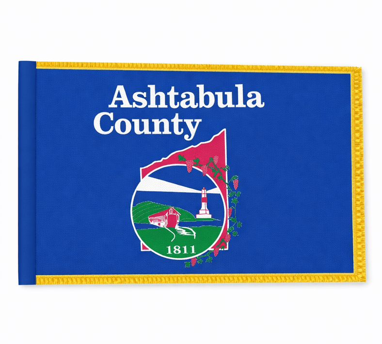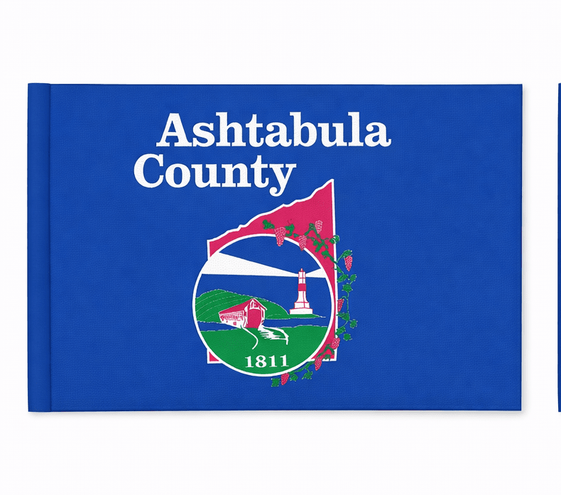 This blue flag features an outline of the county map. The circular scene in the center shows a light house on Lake Erie, and a covered bridge over a river. With sixteen covered bridges, Ashtabula County is tied with Fairfield County for the most covered bridges in Ohio. A vine of flowers appears on the right side. Ashtabula County was organized in 1811. It was named for the Ashtabula River, which means "fish river" to the local Native Americans.