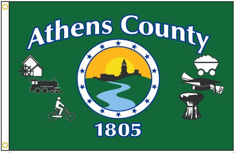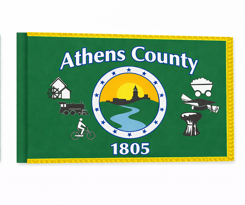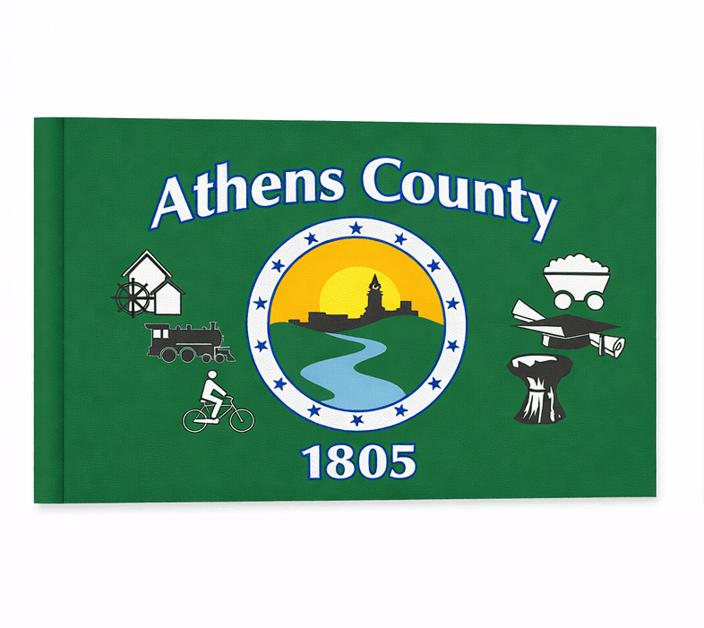 This green flag shows symbols from the local economy, a mill, railroad engine, bicycle, coal car and wheat. A cap and diploma remind us of education and Ohio University. The county seal in the center is circled by fourteen green stars and shows the skyline of a city and a river. 1805 is the year Athens County was established. It was named after Athens, Greece, an early democratic city.