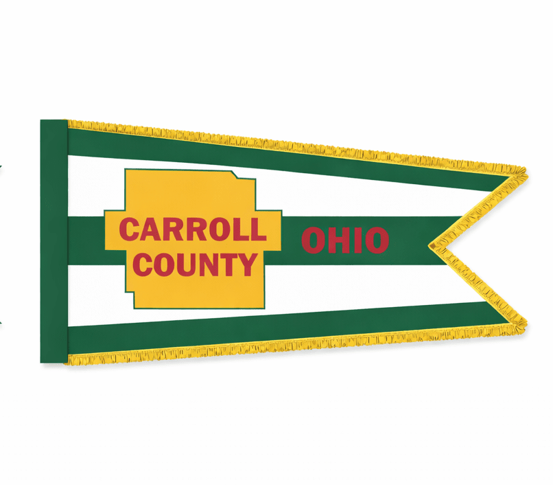 The shape of this flag, like the Ohio flag, is called burgee. The Carroll County flag has 3 green stripes and 2 white stripes. It also features a yellow map of the county. The name of the county reminds us of Charles Carroll, the last surviving signer of the Declaration of Independence.