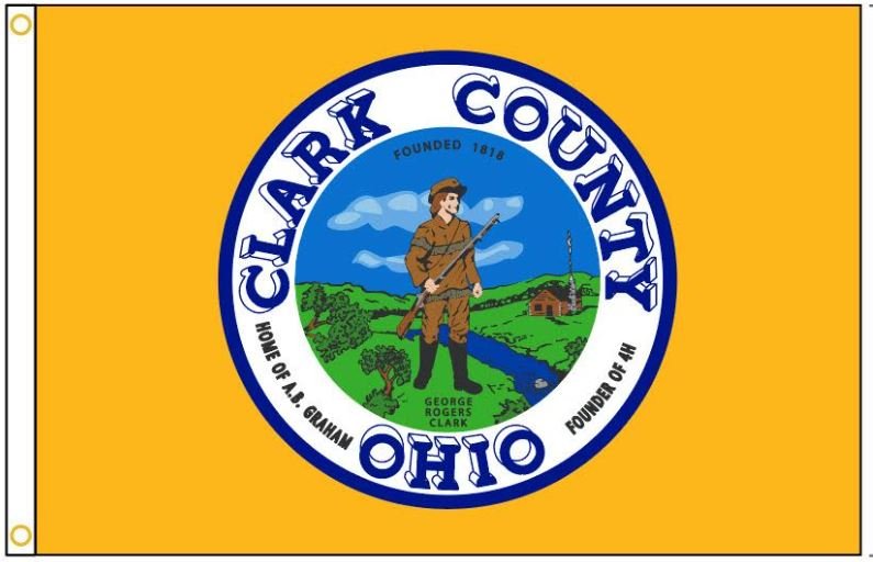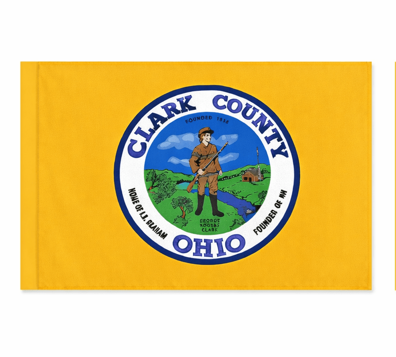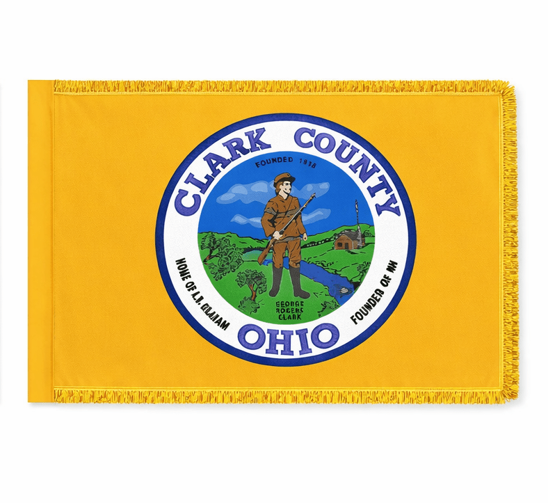 The circle in the center of this marigold colored flag is the seal of Clark County. It shows Brigadier General George Rogers Clark, who the county was named after. He defeated the Shawnee Indians in 1780, and is shown standing on the bank of the Mad River. Clark County was established in 1818, and was the home of A.B. Graham, the founder of 4-H. The county flag is used at all county institutions, although some have a color seal and others do not.