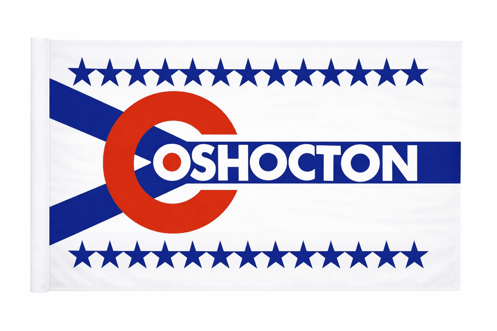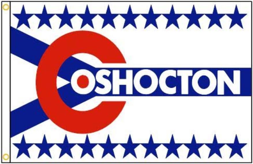 The Coshocton City Council adopted the Coshocton Flag design in 1971. Karen Uher, a 13 year old girl, won the contest sponsored by the Chamber of Commerce. The flag was officially adopted as the county flag in 2003. The flag design contains twenty-two blue stars, which represent each township in Coshocton County. The "Y" configuration represents the Walhonding river and the Tuscarawas River that meet at Coshocton City to form the Muskingum River. The red dot inside the O reminds us of the Ohio flag. This red, white and blue flag spells out the name Coshocton with a large red letter C. The name Coshocton sounds like the Native American village name for "Black Bear Town" or "where there is a river crossing."