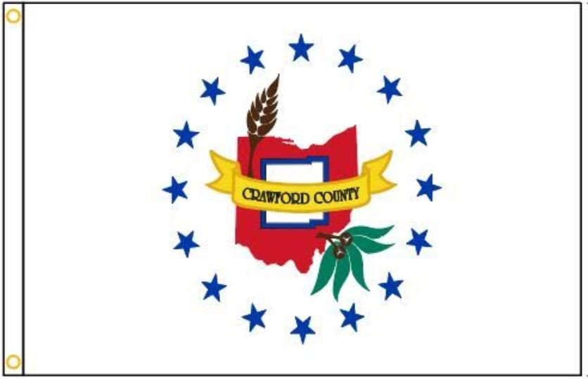 In 1988, after the county received various requests to fly a flag, the County Commissioners decided to solicit ideas from each school building in the county. The winning design was by Crestline High School students Tim Biglin, Jenny Metzger, Shellie Rall, Alex Riggleman and advisor James Klopfenstein. The outline of Crawford County appears inside a map of Ohio in the center of this white flag. These are surrounded by 16 blue stars in honor of the county's townships. Wheat is an important crop in the county, and the Buckeye leaves remind us of the official state tree. This county was named for Col. William Crawford who was burned at the stake by Native Americans in 1782.