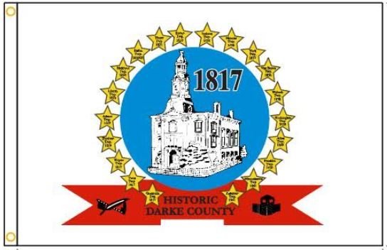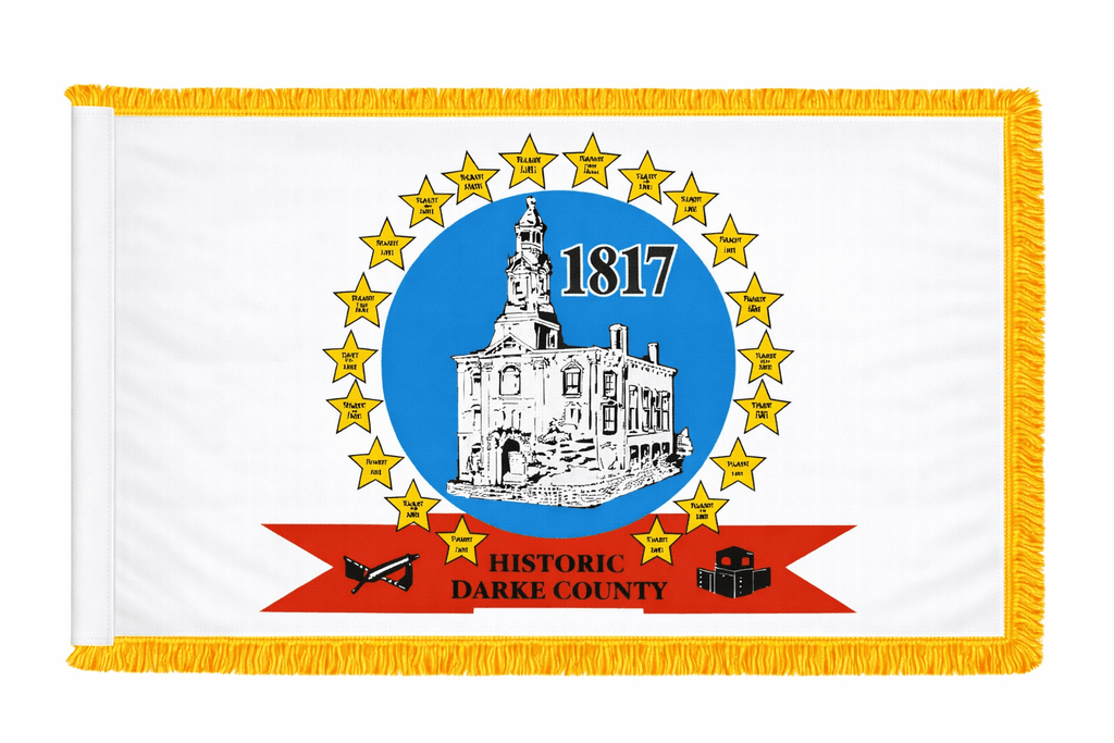 The center circle of this white flag shows the Darke County Courthouse and the date the county was organized, 1817. On the red banner below, a quill pen and calumet pipe remind us of the Treaty of Greenville in 1789. This important document was signed at Fort Greenville. Each of the 20 yellow stars are marked with the names and dates of a township. Mary Profitt designed this flag, and it was adopted on June 19, 2002. Darke County was named after Gen. William Darke of the Revolutionary War.
