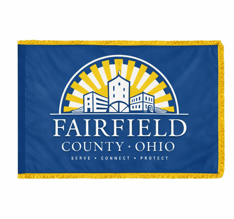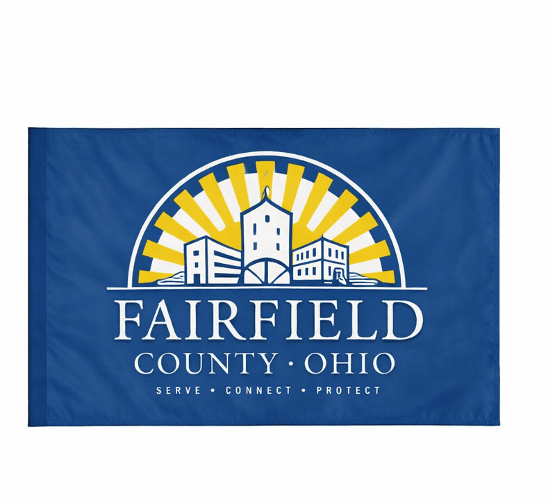 As part of the preparations for Ohio's Bicentennial, Fairfield County commissioners solicited flag designs from county residents and students. In 2002, a committee decided to make a composite from designs submitted by Berne Union High School student Ambrianna Robinson, local artist Cheryl Fey and Norman Swartz. The committee chose a burgee rather than a standard shape to match Ohio's state flag. The images on the flag represent industries and landmarks which are associated with Fairfield County: the cornstalks for agriculture, the dinnerware for Anchor Hocking glass, the oil derrick for one of the county's earliest industries, and the covered bridge to symbolize the county's rich covered bridge heritage and commitment to restoration of these structures. The sunburst inside an outline of Fairfield County represents the county's bright future. The committee was somewhat divided on the inclusion of the oil derrick, and animated discussions centered around whether the public, particularly those not from Fairfield County, would mistake the derrick fro a cellular tower. The shed at the bottom right of the derrick was added in an attempt to clarify the image as an oil derrick. This county was named by Arthur St. Clair, Governor of the Northwest Territory, because of its beautiful fields.