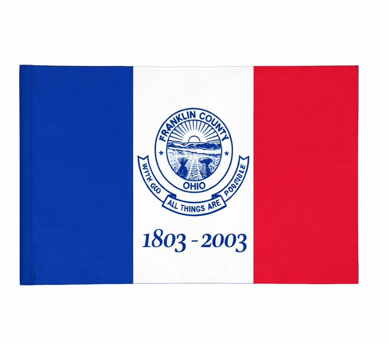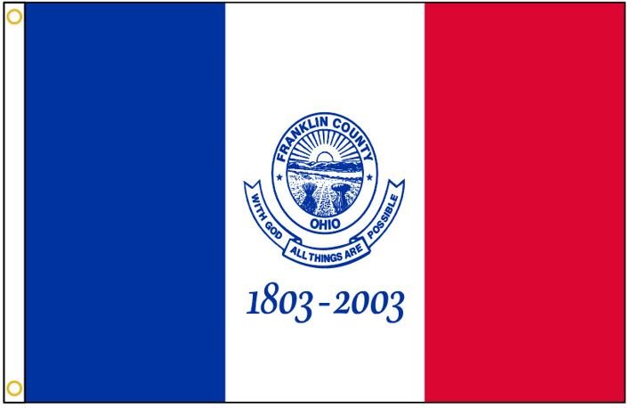 This flag was adopted by Franklin County on April 30, 1987. This red, white and blue flag is reminiscent of the French Flag, and also of the flag of the City of Columbus, which is the county seat. The seal of Franklin County is printed blue on white in the middle. The picture and the motto are the same as those used by the State of Ohio, and remind us that state government is centered in Columbus, Ohio. Franklin County was established in 1803 with the birth of the state. Both celebrated their bicentennials in 2003. The county was named after founding father, Benjamin Franklin.