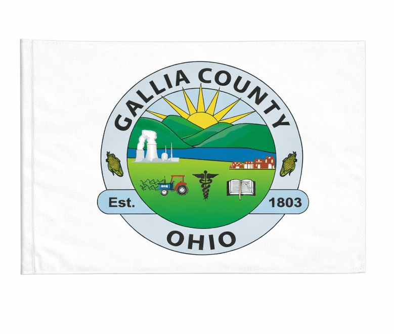 The county seal in the center of this white flag shows a sunrise scene and symbols for what is important to Gallia County. The tractor and corn represent agriculture, and the book and glasses remind us to learn by reading. The caduceus is a medical symbol. Behind the town and power plant, the Ohio River and rugged hills represent the scenery of the Allegheny Plateau. The county was established in 1803, and was named by French settlers. "Gallia" is the Latin word for "Gaul," an ancient name for France. Many immigrants from France settled in this county.