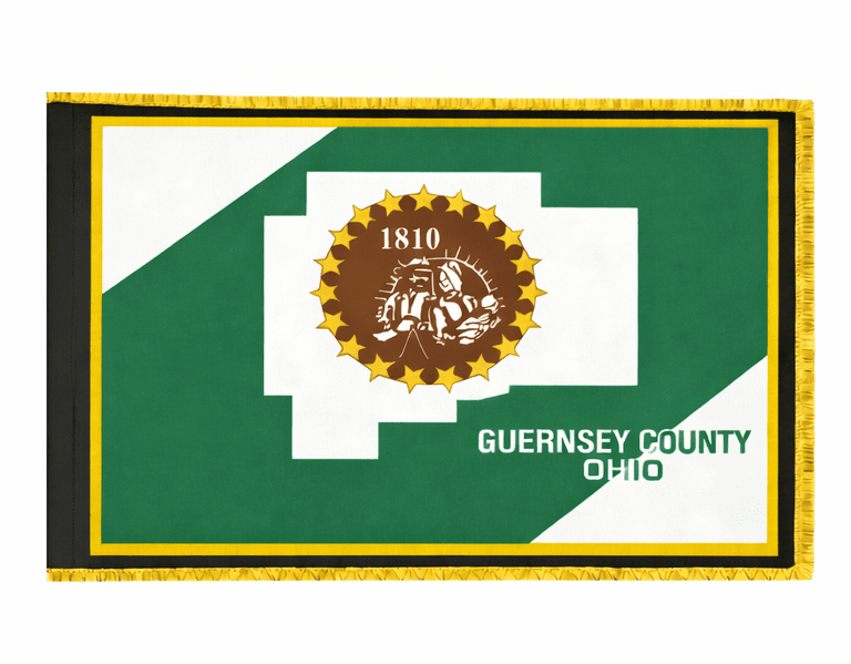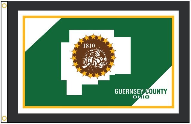 This green, brown, yellow and white flag centers on a white silhouette of Guernsey County. Inside that outline appear an image of a pioneer family in a stagecoach, and a circle of nineteen yellow stars. Zane's Trace and the National Road went through this area, and were important for early American travelers. The flag is the result of a contest. It was adopted in 1987. The name of the county reminds us that many of its early settlers came from the Isle of Guernsey in the English Channel.