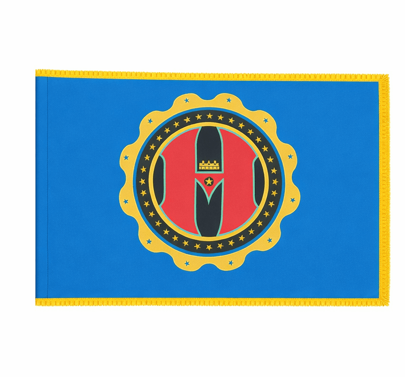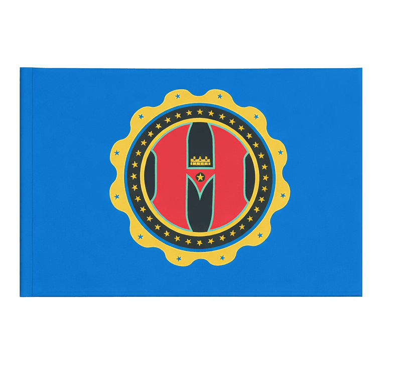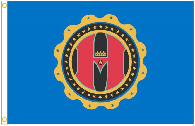 The Hamilton County flag was selected from ninety-five entries from local artists and students. The flag development process was a partnership between Hamilton County and ArtWorks, a local non-profit that provides training and opportunities in the arts for local youth. ArtWorks sought entries from local schools, the general public and its own network of local artists. A panel consisting of County officials, citizens, and ArtWorks staff helped select three finalists and the final design. The winning design was created by Justin Green, a graphic artist from Oakley. The flag was adopted on June 14, 2002. The flag features a red "H", trimmed in green symbolizing Hamilton County. The "H" is encircled by an "O" representative of Ohio. Hamilton County's twelve townships are symbolized by the "cogs" of the circular motif. The flag includes thirty-seven yellow stars representing the twenty-one cities and sixteen villages of Hamilton County. To the original design, twelve blue stars were added on the "cogs" at the request of County Auditor Dusty Rhodes, who said that townships also deserved stars. The county is named after Alexander Hamilton, the first U.S. Secretary of the Treasury. It was established in 1790.