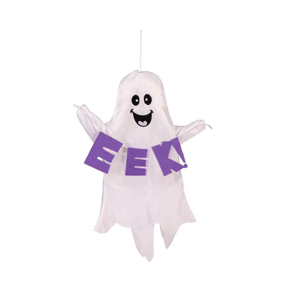 Bring a playful and festive touch to your Halloween decorations with this charming Hanging Ghost Trio. Each friendly ghost is crafted from lightweight, flowing white fabric, giving them a whimsical, ethereal look as they sway in the breeze. This set includes three unique ghosts, each holding a different phrase: "BOO" in vibrant orange, "EEK" in playful purple, and "BEWARE" in spooky green. Their cheerful, smiling faces make them a perfect fit for a family-friendly haunted house or a festive fall display.