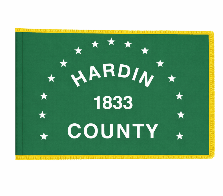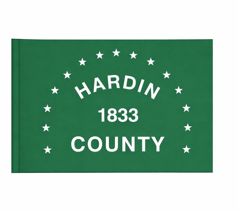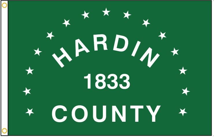 The Hardin County flag is green in background, representing the agricultural background of Hardin County. White stars represent the fifteen townships of the county. The county was organized in 1833 and this date is displayed in the center of the flag. An original flag for the County was designed by former County Commissioner, Stuart Rogers and Rodney K. Rogers and was sewn by Mrs. Delores Warmbrod. This flag was made for the dedication of the gazebo and flagpoles at the Hardin County Fairgrounds and first flown September 4, 1984. The current flag has been reproduced in green nylon with white printing, through a silk screening process. The county was named after Colonel John Hardin who was executed by Native Americans while on a peace mission in 1792.