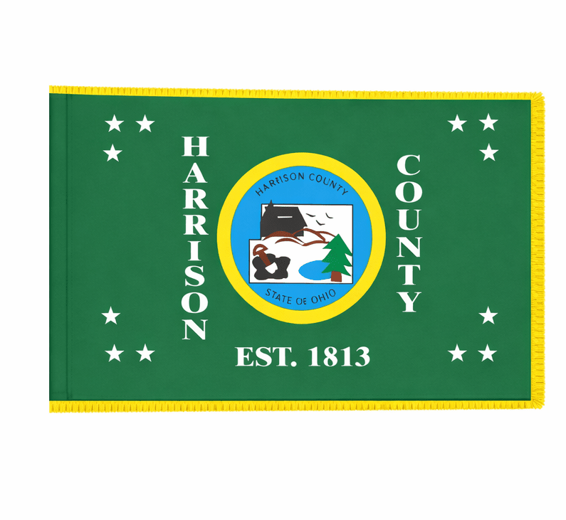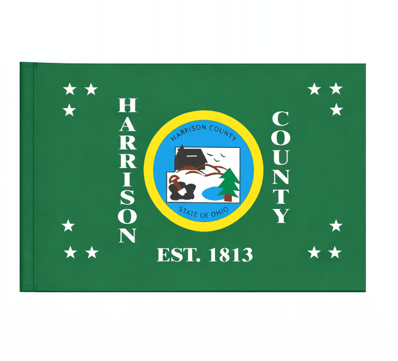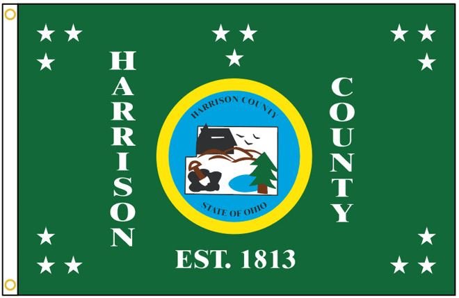 The Harrison County flag is green with the county seal in the center. The seal shows an outline of the county with symbols of importance to the residents, a farm, tree, lake and coal. The circle represents the close connection of area businesses, schools, organizations and communities. Fifteen white stars appear in five clusters of three, representing fifteen townships in the county. The flag was designed by the New Rumley 4-H Club in 2002. Each color is symbolic. The green field reminds us of the agricultural background of the county and brown stands for farms and rural areas. Gold represents famous individuals from Harrison County such as Clark Gable, General George A. Custer and U.S. Representative John A. Bingham. The blue water signifies recreation on the county's beautiful lakes, Tappan, Clendening and Piedmont. Black represents the rich coal industry that the county is noted for. The county was established in 1813 and was named after William Henry Harrison, the first U.S. President to be elected from Ohio.