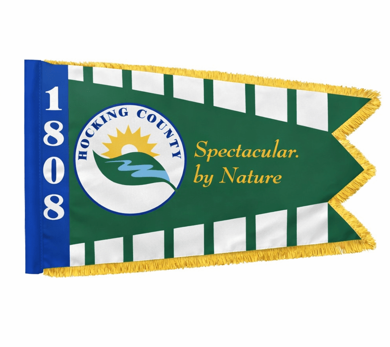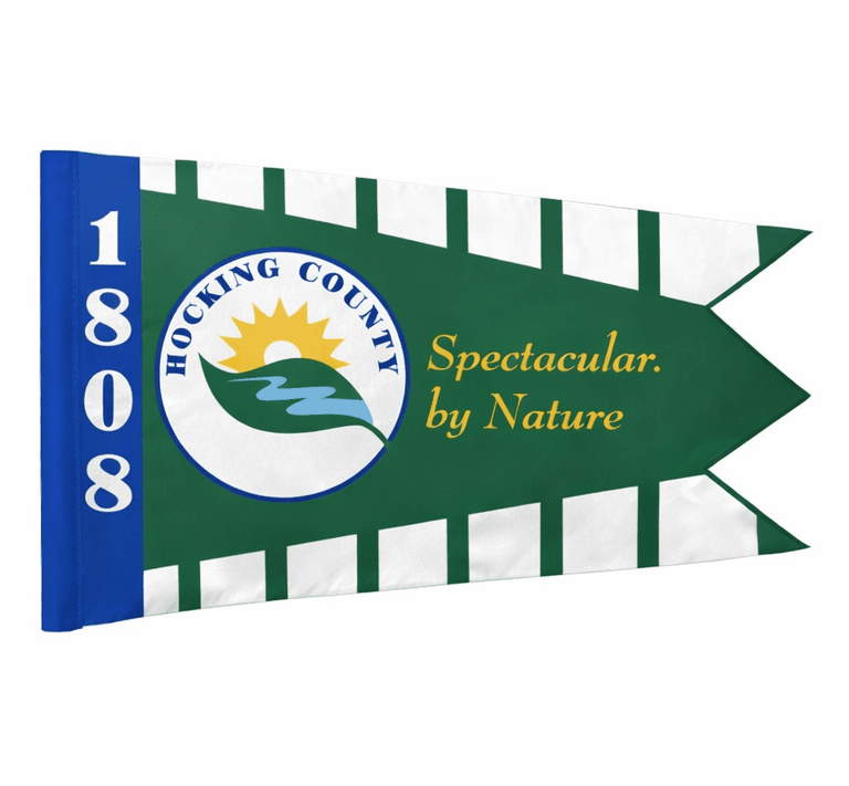 Pam Nelson designed the Hocking County flag during a contest held in conjunction with a statewide request from the Ohio Bicentennial Committee for each county to design a flag to be flown during Ohio's 2003 Bicentennial celebration. The Hocking County Commissioners declared Mrs. Nelson as the winner of the contest on July 18, 2002. The design of the flag is a representation of characteristics found in Hocking County. The blue/green is for the Hocking River and Hocking Hills. The green stripes are for the twelve townships. The three points stand for the three counties from which Hocking County was formed: Athens, Fairfield and Ross. The county was established in 1818, and its name is from the Native American word "Hoch-Hoch-ing" which means "in a bottle."