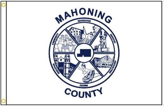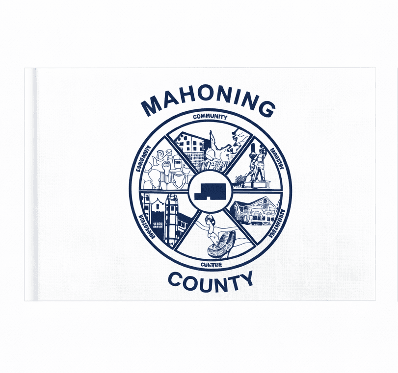 The Mahoning County flag was designed by Heather Heaven of Canfield, and introduced at the Canfield Fair in 1986. The flag has a blue design on a white field. It shows six aspects of life in the shape of a wheel or pie. The images are labeled Recreation, Industry, Agriculture, Culture, Education and Community. The hub of the design is a silhouette of the county. Mahoning County was established in 1846. Its name comes from the Mahoning River or from the Native American term, "Mahoning" meaning "at the [salt] lick."