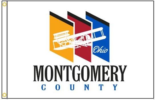 The Montgomery County flag was designed by Kevin Montgomery, a designer for a local public relations firm, Flynn Sabatino and Day. His last name is a coincidence. The design project involved the Administrator, Communications Director and the public relations firm. The flag was adopted in the summer of 2001. It replaced the former 1973 Montgomery County flag by Jim Moyer. The flag features the county logo as seen on the county's water tower near I-75. The colors for the logo and flag were chosen because they are classic. The Wright B Flyer symbolizes innovation, which the area and government are known for. The county was named for General Richard Montgomery of the Revolutionary War.