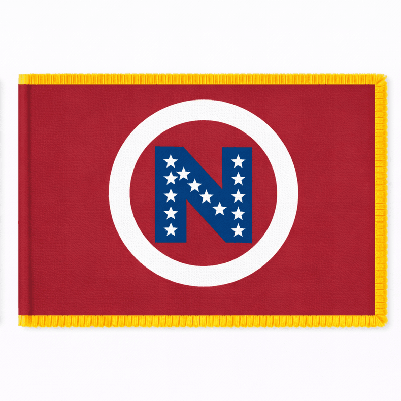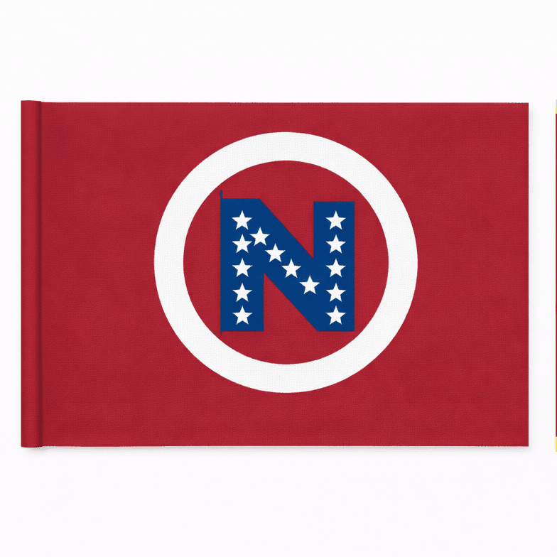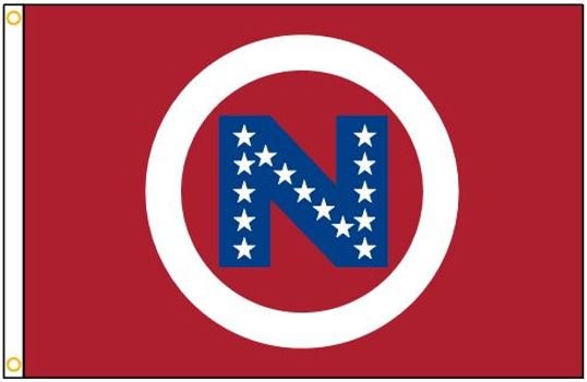 This red, white and blue flag was designed by Charles Stoneking, incumbent county commissioner, in 1985, and adopted by the Commission that same year. The white "O" stands for Ohio, the blue "N" for Noble, and the 15 white stars represent the 15 townships of the county. The red, white, and blue colors were chosen to identify with the United States of America. This information was collected from a county clerk by John Purcell. Noble County was established in 1851. It was named for pioneer James Noble, the first settler to buy land there in 1814.