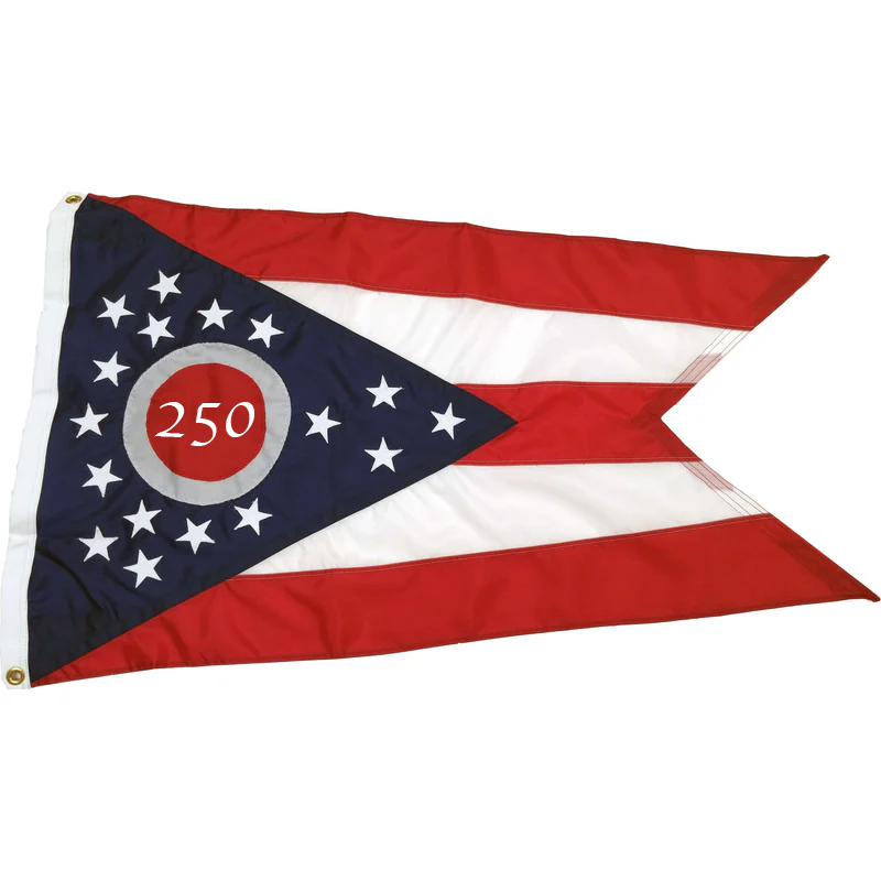 These flags are a flag lady Exclusive design tying the Ohio Flag into the America 250 celebration. Get them in 200 denier nylon either digitally printed or sewn. We are capping the amount of these that we will make. Once they're sold, we won't make any others.