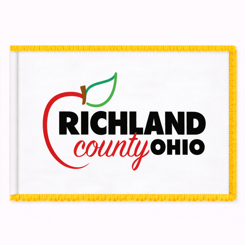 Designed in 2002 at the request of the Ohio Bicentennial Commission, this white flag features the name of the county. The apple reminds us of John Chapman or "Johnny Appleseed," who crossed the area planting apple trees in the 1800's. Richland County was established in 1808. It was named because of the rich soil found there.