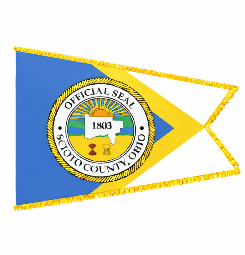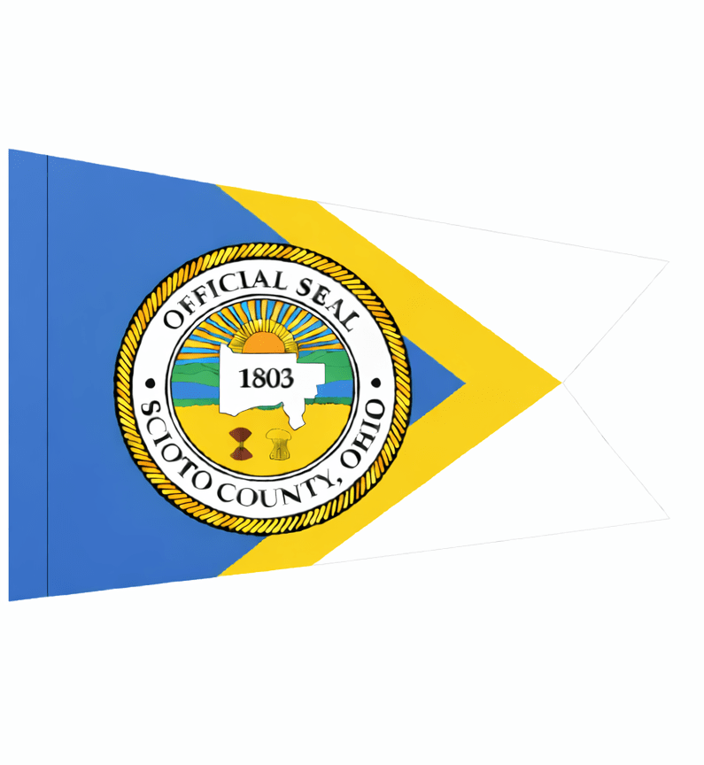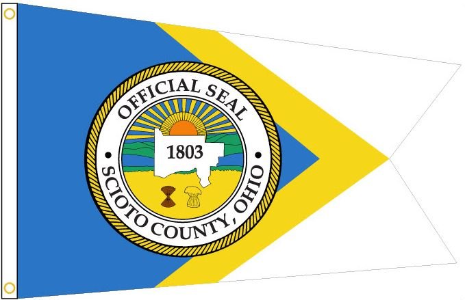 This burgee is the same shape as the Ohio State Flag. The background is blue, yellow and white. The Official Seal of Scioto County appears in the center, and is reminiscent of the Great Seal of the State of Ohio. An outline of the county shape is in the middle. This flag replaces a previous 1986 flag designed by Amy Brown, which was a white burgee. Scioto County was established in 1803. Its name comes from the Scioto River which runs through it, and from a Native American word meaning "deer." Sources: Knepper, George W. ed., Tanya West Dean, and W. David Speas. Along the Ohio Trail: A Short History of Ohio Lands. Columbus: Auditor of State, Jim Petro, 2001. Purcell, John. 2007. Personal communication