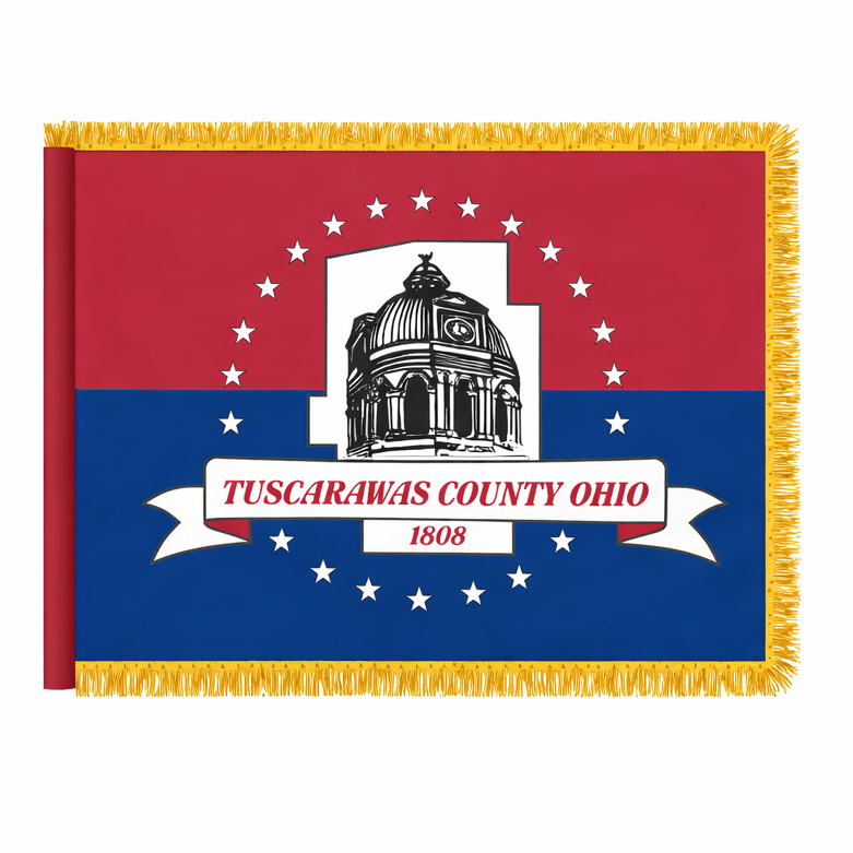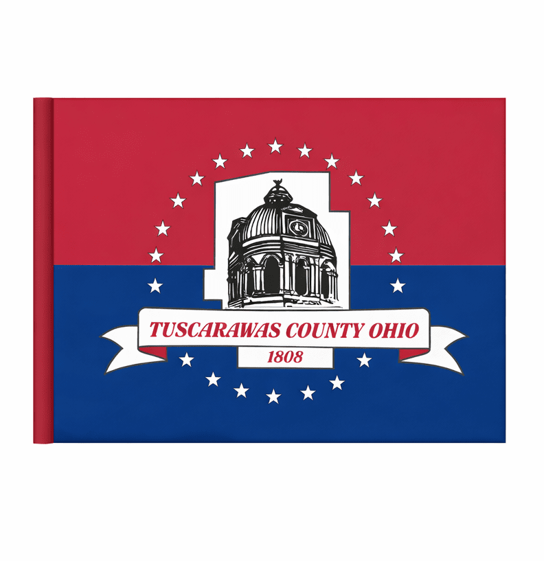 In 2001, County Commissioner Pancher assembled a Flag Committee which solicited ideas from the public. From the submitted designs, this red, white and blue entry was officially adopted on March 25, 2002. The flag was designed by Cathy Straub, and features the county courthouse dome within an outline of the county itself. Encircling the courthouse image is a circle of white stars representing each of Tuscarawas County's twenty-two townships. This part was devised by Straub's thirteen year-old son Bryan. Tuscarawas County was established in 1808, and named for the Tuscarawas Indian Tribe.