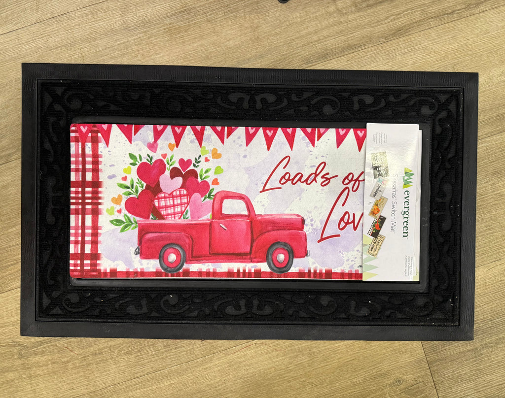 Transform your entryway with the Valentine’s Day Sassafrass Mat Insert! Featuring a charming red truck adorned with hearts, this decorative mat adds a touch of romance to your home. Durable and weather-resistant, it’s easy to clean and perfect for year-round use. Share the love with every step!