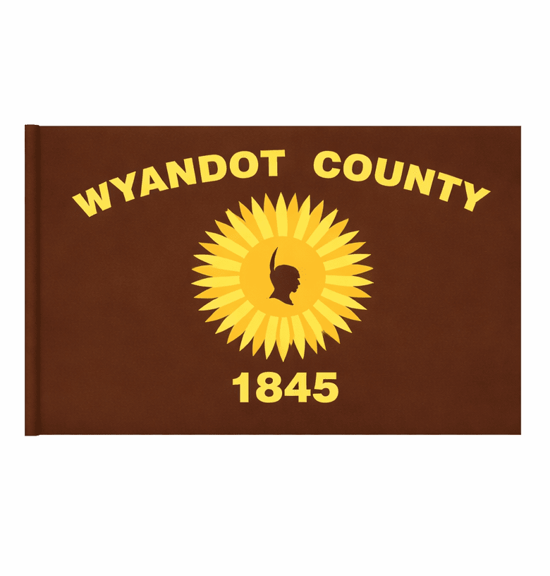 The Wyandot county Flag was officially adopted by the commissioners on September 22, 1975. It was designed by Mrs. Madeline Martin of Upper Sandusky, and was selected in a contest conducted by 4-H clubs during the summer of 1975. The brown background of the flag symbolizes the rich soil which attracted both the Native Americans and early settlers to this area. The sunburst was an important symbol in Indian culture and yet toady represents life and growth. The silhouette of an Indian brave serves as the main focal point and helps all of us focus on our heritage. The flag also carries the date Wyandot County was established, 1845, making it one of the last Ohio counties formed. The flag provides a symbol of our rich agricultural and historical heritage while providing us with a vision for the future. Just as we know the sun will encourage new life and continued growth, we know the people of Wyandot County will continue to meet the challenges of the future. The county is named after the Wyandot Indians, the last tribe in Ohio to cede their reservations in 1842.